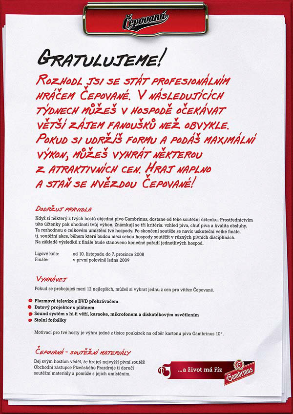 KLIENT: GAMBRINUS Promo zaměřené na výčepní restaurace Gambrinus, které bylo v duchu, že i správné čepování piva je sport a svým způsobem umění, ve kterém se dá soutěžit a určit vítěze. Cílem akce bylo nenásilným způsobem přesvědčit hospodské, aby o svůj výčep a točené pivo dostatečně pečovali. Zároveň dodržovali stanovenou míru piva, teplotu a čistotu půllitrů. Hosté restaurací a hospod měli za úkol hodnotit kvalitu piva podle jednotlivých parametrů a na konci akce byl nejlepší výčepní odměněn hodnotnou cenou.