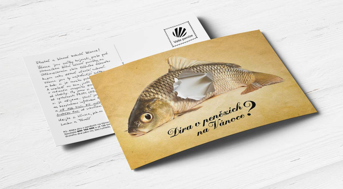 KLIENT: PROFICREDIT Pohlednice, která se roznášela před Vánocemi do poštovních stránek. Jedná se o jasné a lehce pochopitelné sdělení pro cílovou skupinu. Jde o slovní metaforu, která vyjadřuje momentální nedostatek peněz.