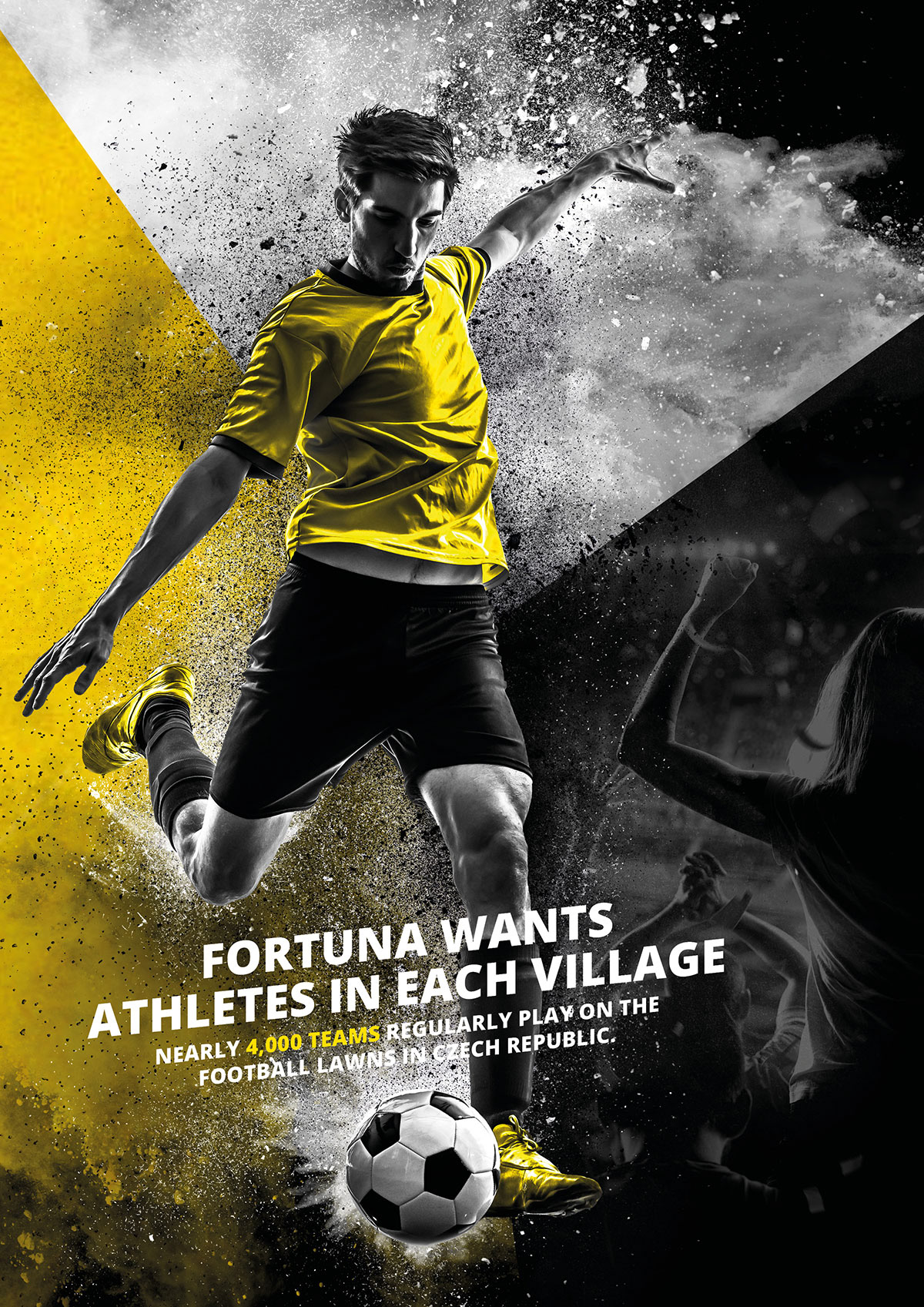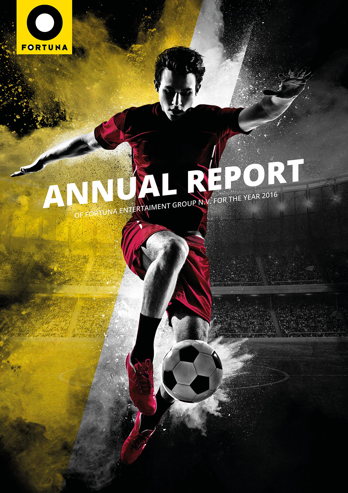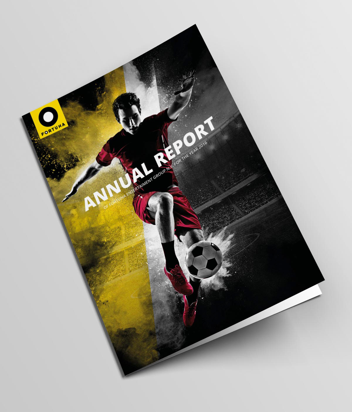 KLIENT: FORTUNA Další grafické ztvárnění výroční zprávy sázkové kanceláře se sportovní fotbalovou tématikou jejíž součástí byla i příprava dynamických vizuálů ve firemním barvách.