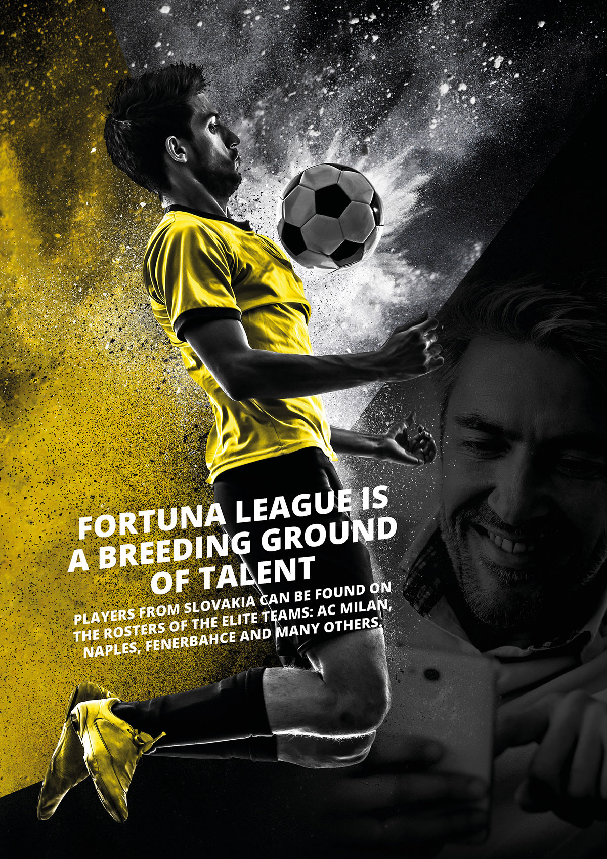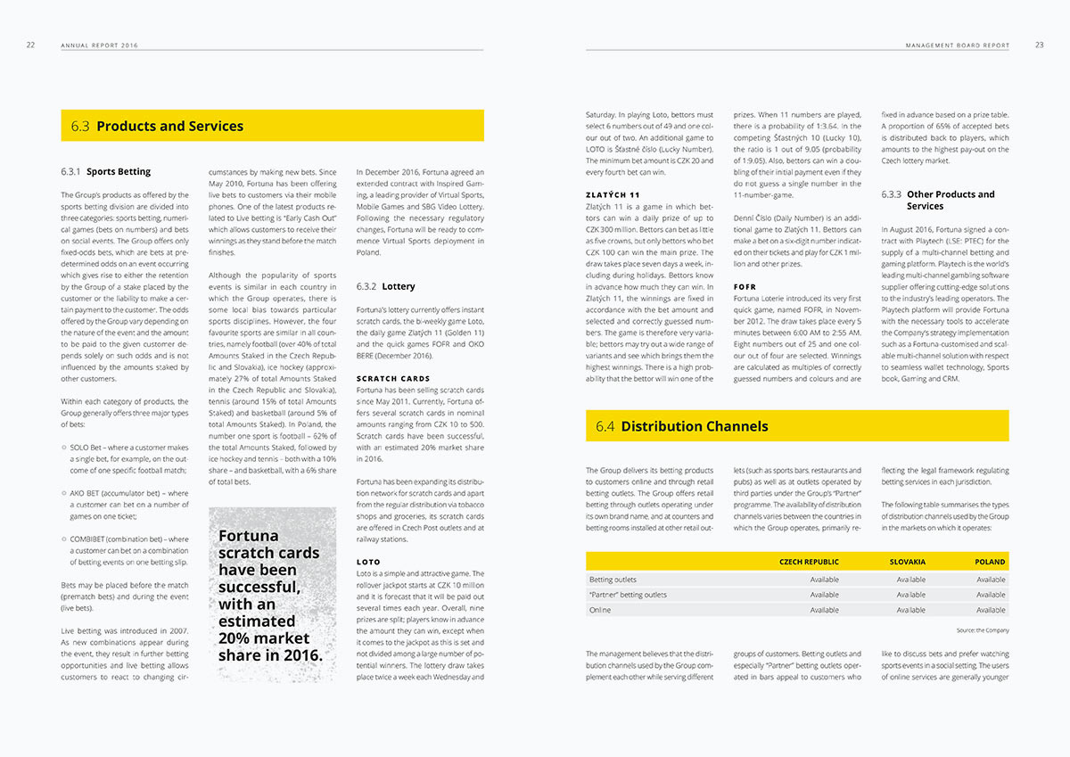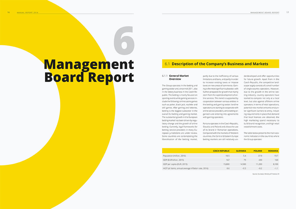 KLIENT: FORTUNA Další grafické ztvárnění výroční zprávy sázkové kanceláře se sportovní fotbalovou tématikou jejíž součástí byla i příprava dynamických vizuálů ve firemním barvách.